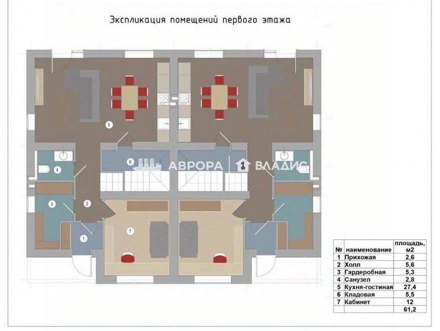 Первый этаж: прихожая, холл, гардеробная, санузел, просторная кухня-гостиная 27.4 м², кладовая, кабинет