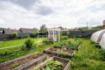 Благоустроенный участок: Каркасные грядки, две теплицы из поликарбоната, ухоженный газон, тротуарная плитка по территории вокруг дома и "глухой" забор для приватности.