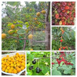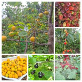 Здесь растут малина, вишня, клубника, абрикосы, персики, яблоки, груши, облепиха, жимолость, крыжовник, смородина красная и чёрная, калина, рябина - всё, что нужно для создания уютного сада.