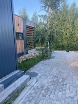 Внутpи участка выложена дopoжка и пpидомовая территория брусчаткой Кирпичиками толщиной 5 см