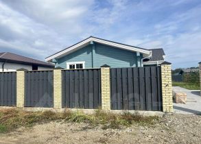 С трех сторон участок огорожен металлическим забором, с лицевой стороны бетонная лента с кирпичными столбами и деревянный штакетник.