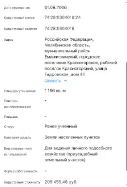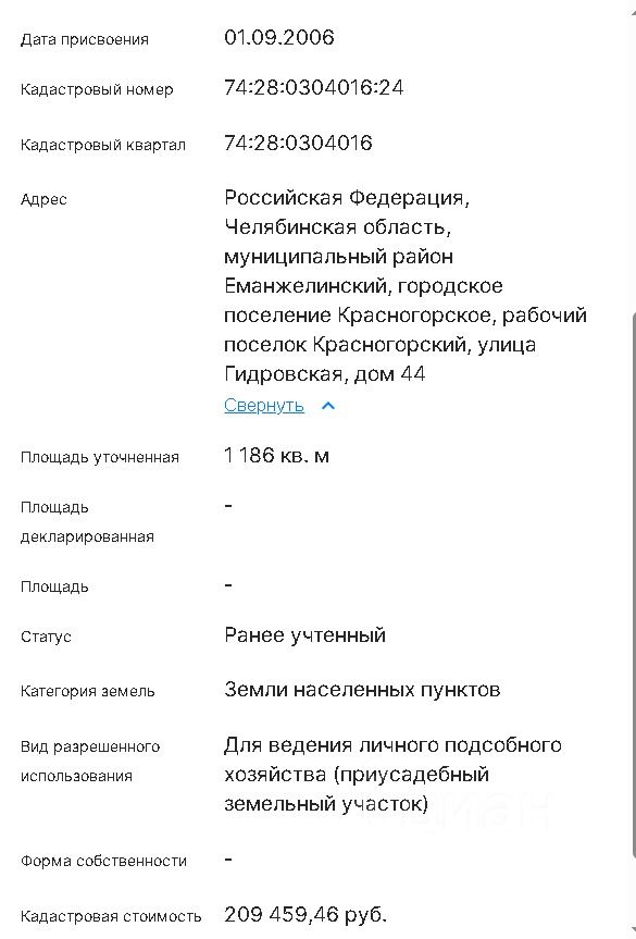 Кадастровая стоимость участка составляет: 209.459 руб.