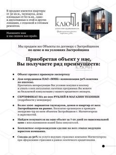 В продаже имеются квартиры от 30 кв.м., таунхаусы, дома площадью от 60 м.кв., одно- и двухэтажные в этой и других локациях, с отделкой и готовым ремонтом.