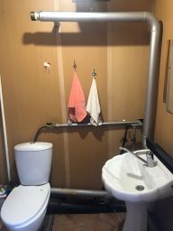 Фундамент бетонный, ленточный. Материал стен: деревянный, рубленный из бруса.  Крыша: профилированный стальной лист по деревянной обрешетке. Окна: стеклопакеты. Полы дощатые с покрытием линолеумом.