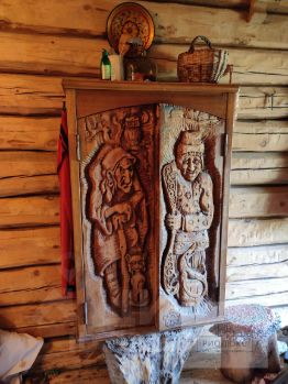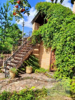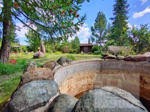 Садовый дом из сруба, выполнен в "духе" русско-народной избы. Имеется действующий камин. Установлен кондиционер. Ставни - ручная работа. Пристрой из кирпича, предполагает собой комнату и хоз.помещение, а так же лестницу с коваными перилами ведущими на второй этаж