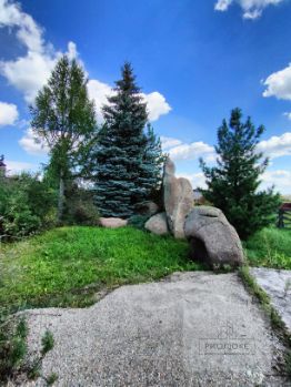 Особое внимание берут на себя камни и валуны, напоминающие элементы японского дзен-сада. Так же присутствуют натуральные камни - яшма, дополняющие композицию ландшафтного дизайна.