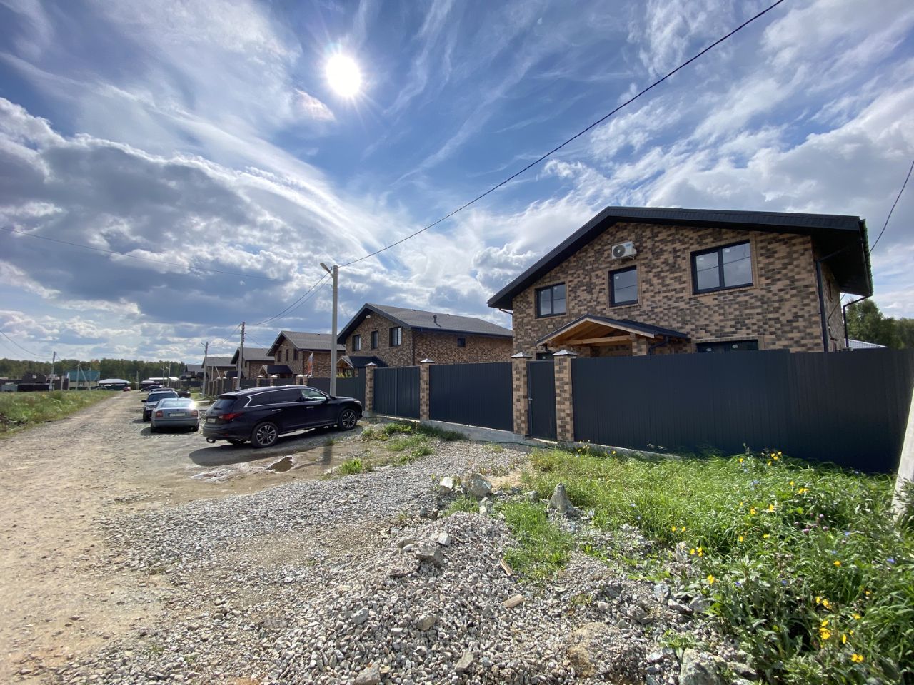 - забор по всему периметру участка (ростверк по двум сторонам, крашеный с 2х сторон пров.лист, по фронтальной стороне кирпичные колонны с распашными воротами и калиткой).