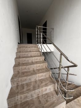 пол всем доме выложен кафелем, на 1- м этаже установлен теплый пол, натяжные потолки с точечными светильниками установлены во всех комнатах