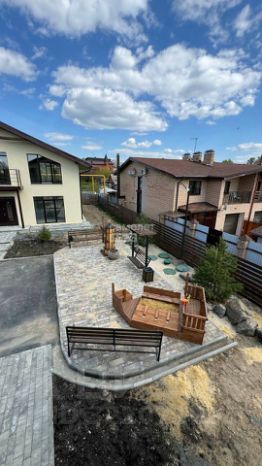 Территория усадьбы огорожена красивым забором с откатными электрическими воротами и объединена общей территорией с детской площадкой, местами прогулок и отдыха.