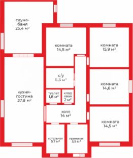 Планировка дома: большая гостиная совмещена с кухней. Там же расположено большое панорамное окно с возможностью выхода на вашу будущую уютную террасу. В доме 4 спальни. Большой и гостевой санузел. Бойлерная комната. Просторная прихожая. Баня.