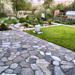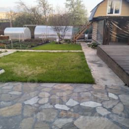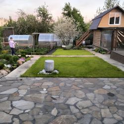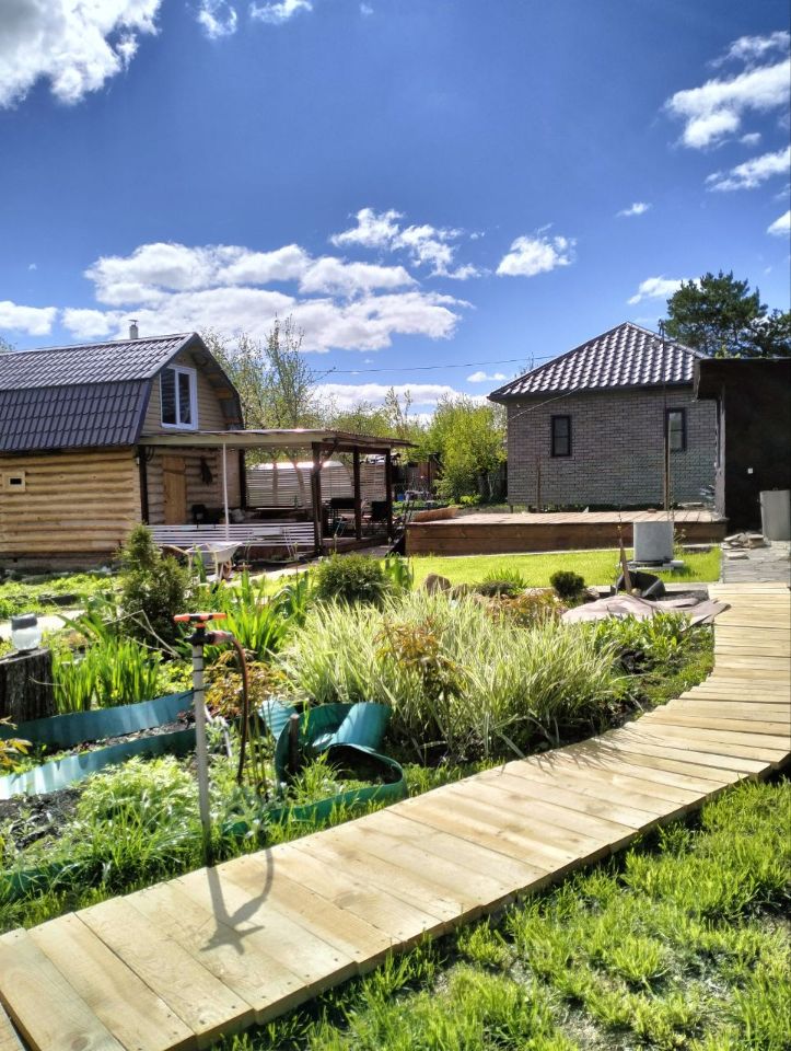 - Благоустройство участка: Пространство благоустроено продуманно и удобно. Имеются две современные теплицы, плодовые деревья и кустарники (яблони, крыжовник, смородина, клубника). Разбит красивый цветник с разнообразием декоративных растений, украшенный аккуратными дорожками и качественным покрытием зелёного газона.