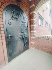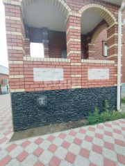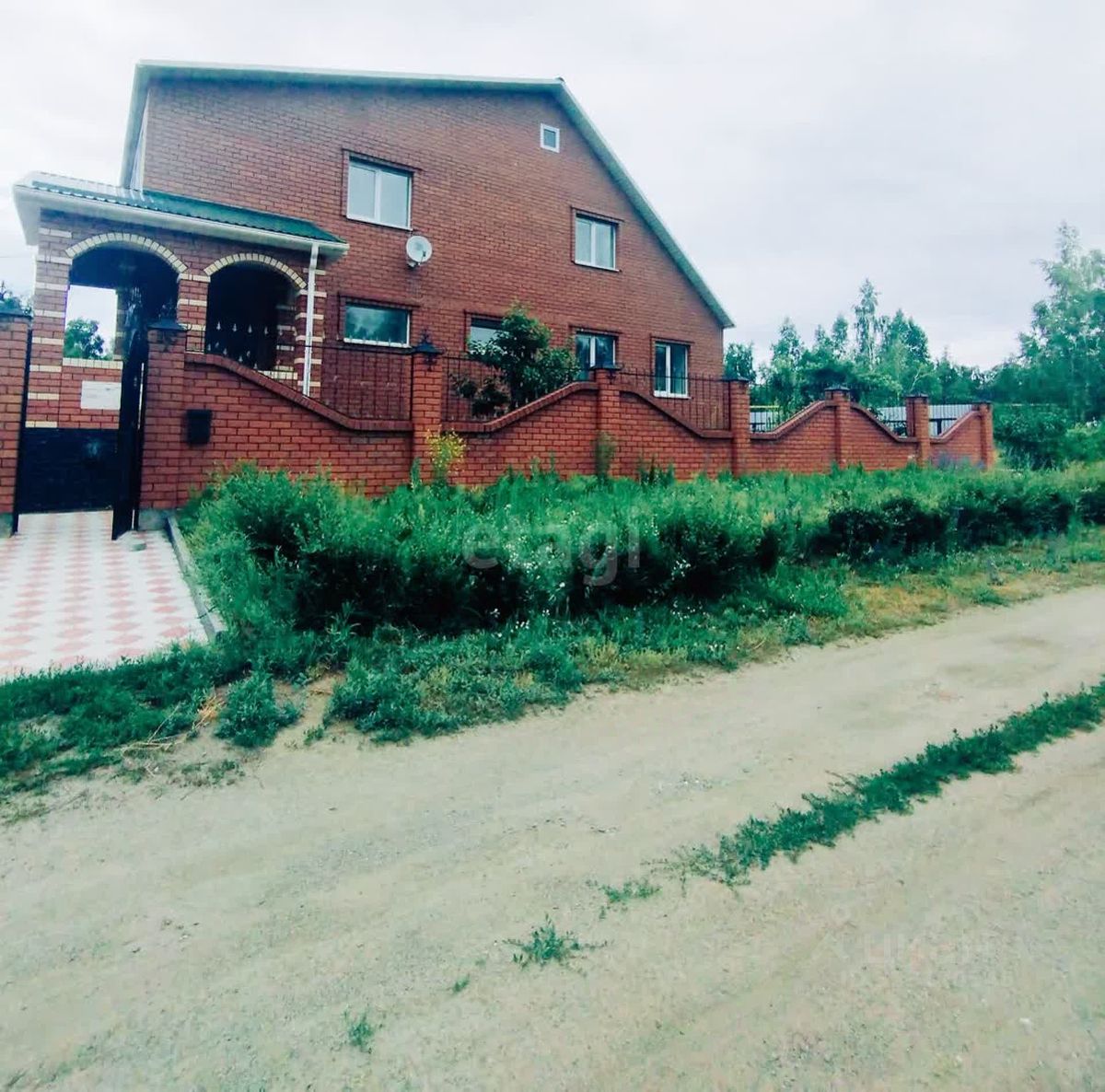 Огорожен кирпичным забором.