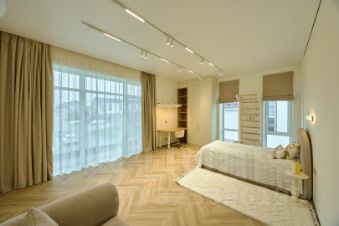 - Мастер-спальня с гардеробной и санузлом — личное пространство для отдыха и расслабления.