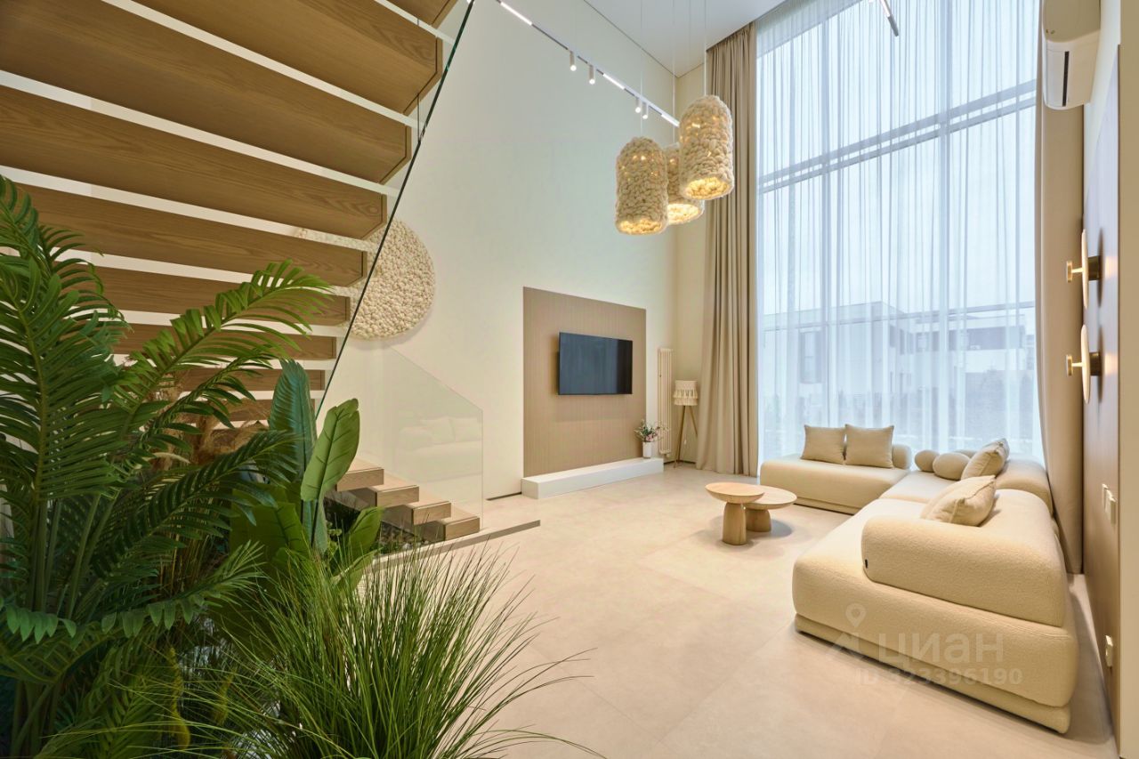 - Просторная гостиная с высоким вторым светом и панорамными окнами — ощущение свободы и уюта.