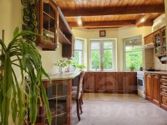 Коттедж построен в трех уровнях в стиле шале. На первом уровне расположена кухня -столовая, гостинная с камином. Во всех комнатах эркерные окна за счет чего в доме всегда светло. Так же на первом этаже есть гостевой санузел и терраса с выходом к мангальной зоне, пруду и в сад. . На втором этаже находится три спальни, большая ванная комната и огромная застекленная веранда с собственным камином. В цокольном этаже расположена сауна, спортзал , бассейн, котельная с коммуникациями.