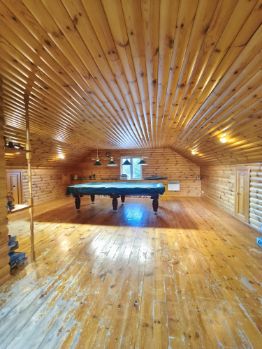 3 этаж: мансарда с бильярдом, идеальное место для семейного досуга, стены обшиты деревом, много света.