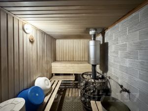 Новая банька из бруса, площадью 24 кв.м., стены обшиты деревом.