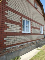 Дом выполнен из пеноблока и кирпича на фундаменте.