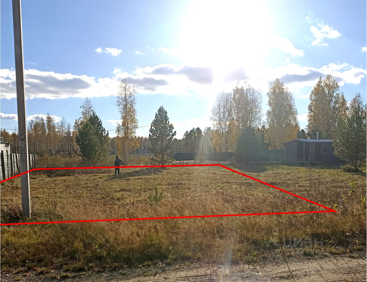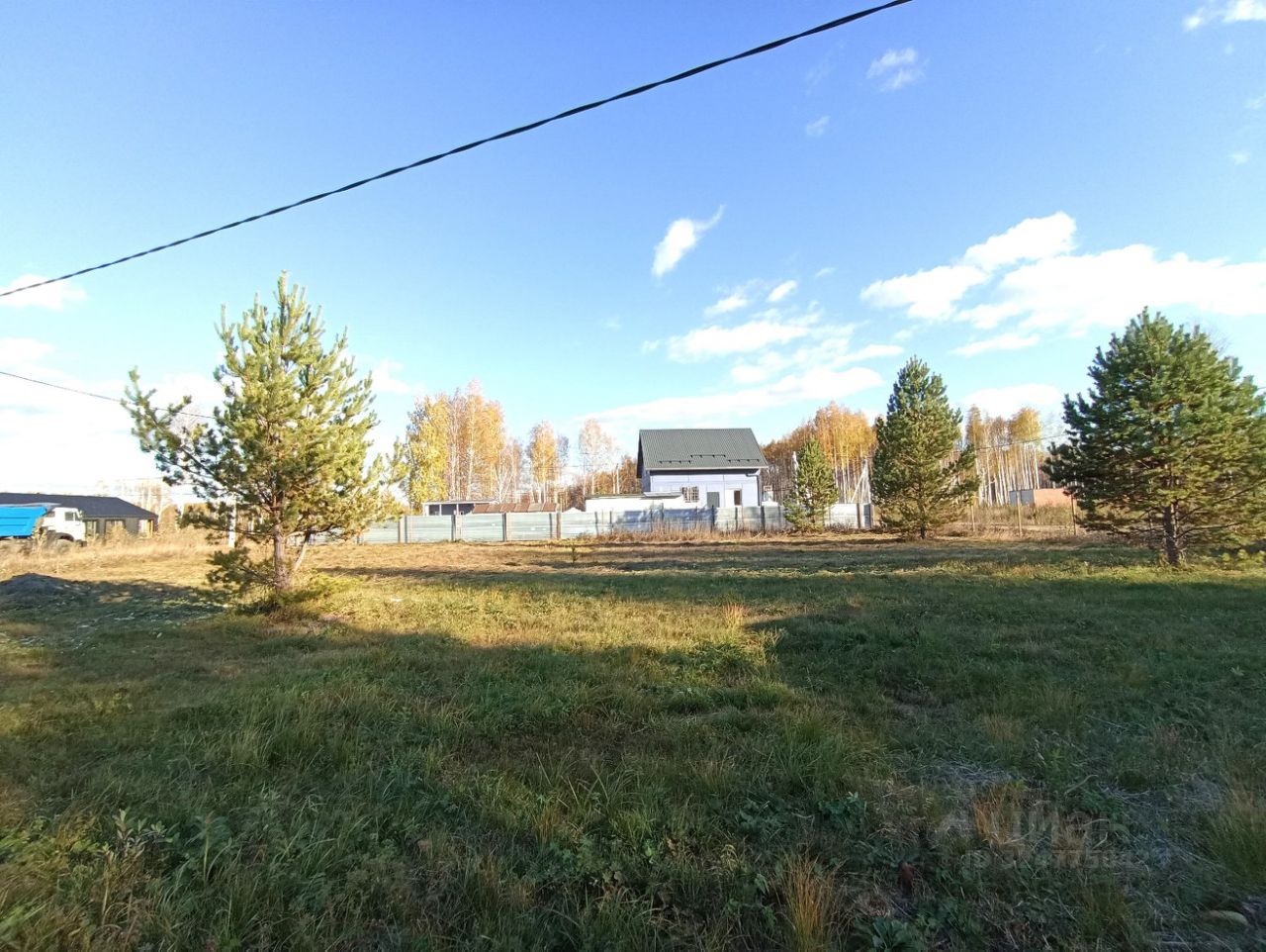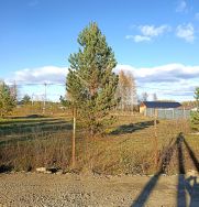 Участок достаточно ровный, есть сосны, с 2 сторон установлены капитальные столбы.