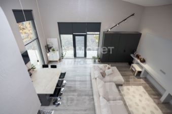 Современный дизайн: Кухня-гостиная в стиле минимализм с высокими потолками и качественным ремонтом создает уютную атмосферу.
