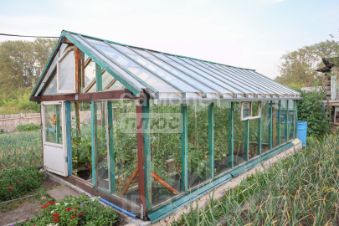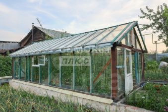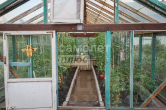 Есть стеклянная теплица и огороженные грядки.