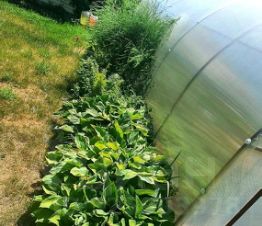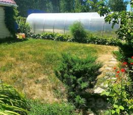 грядки для овощных культур аккуратно спрятаны за теплицей — не портят вид участка.