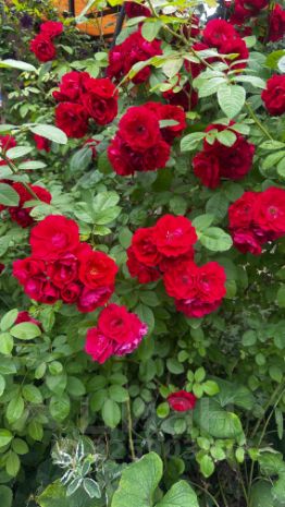 ухоженная территория с обилием декоративных растений: розы, клематисы, виноград, туи, можжевельники;