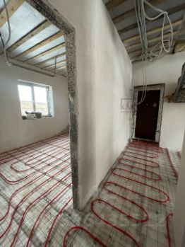 Дом построен из строительного камня 400 мм с утеплением ППС 100 мм и отделкой фасада декоративной штукатуркой. Внутренняя отделка предчистовая: теплый пол, штукатурка, откосы, подоконники, котел.