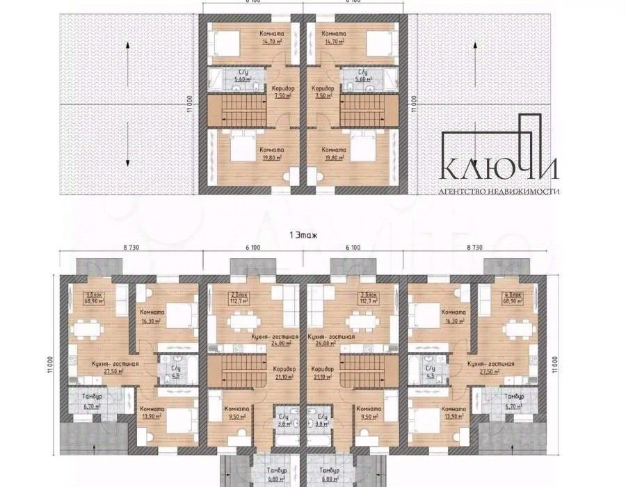 Одноэтажный таунхаус в черновой отделке площадью 69 м² и участком 2,44 сотки.