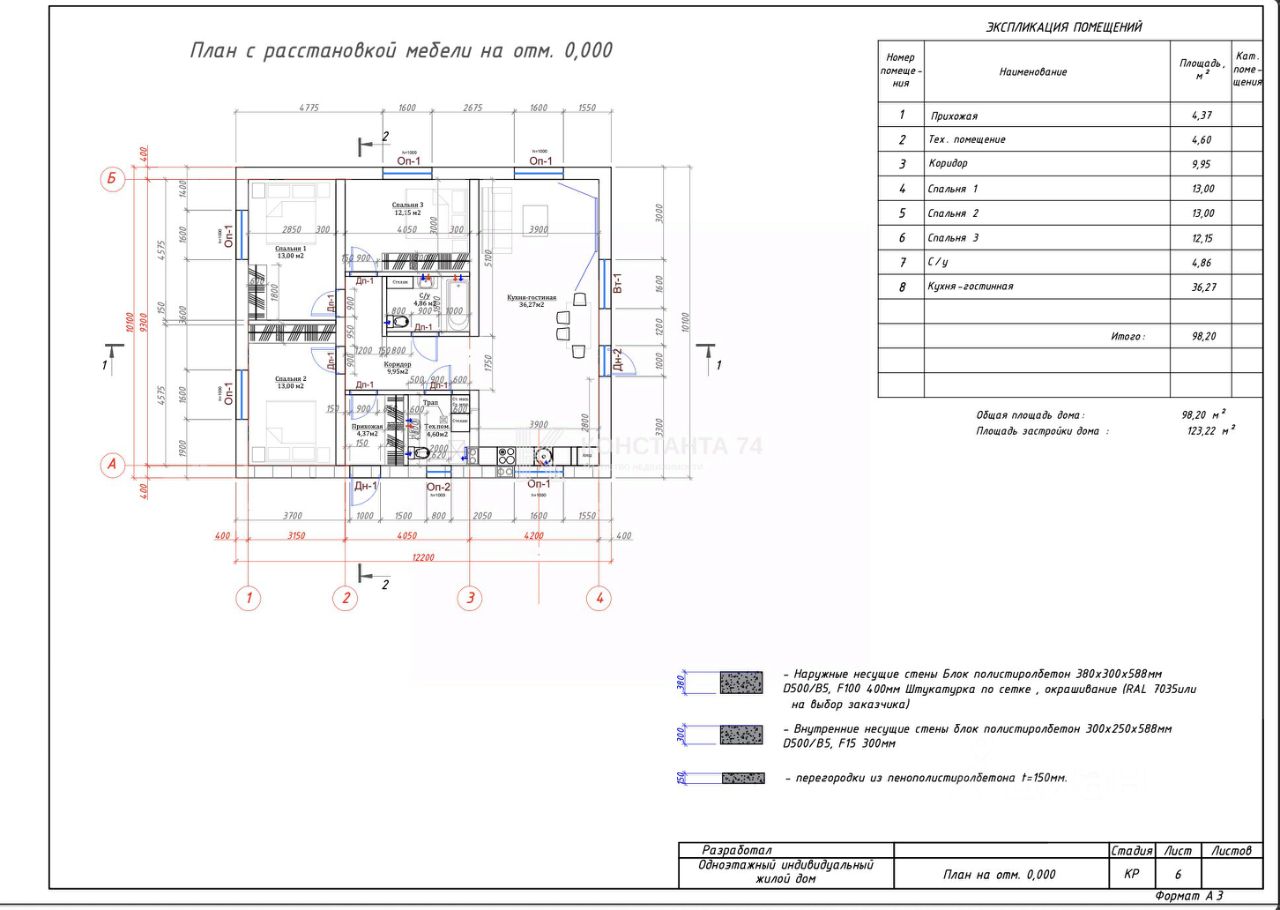 - Стены: блок 400 мм, утеплитель, фасадная штукатурка, внутренняя предчистовая отделка.