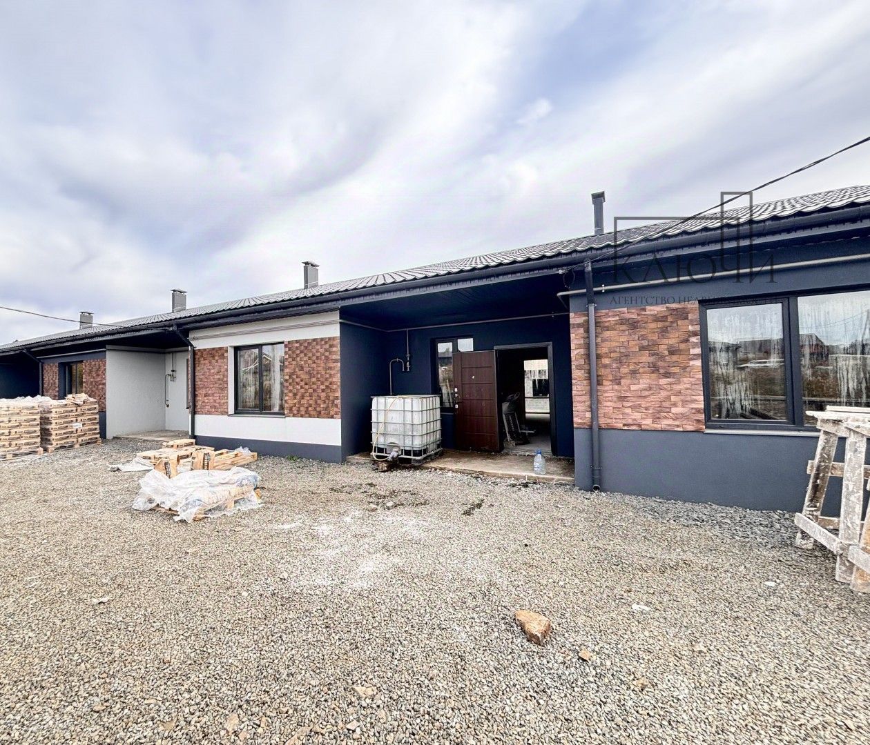 Дом построен из строительного камня 400 мм с утеплением ППС 100 мм и отделкой фасада декоративной штукатуркой со вставками из металлосайдинга и облицовочного кирпича.