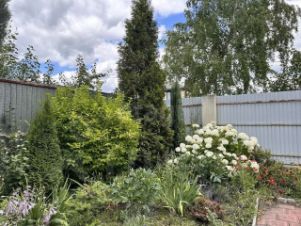 Правильной формы земельный участок 8 соток, ухоженный (ели, туи, можжевельник, сосна, кустарники, розы, гортензии и тд), забор из профнастила по периметру.