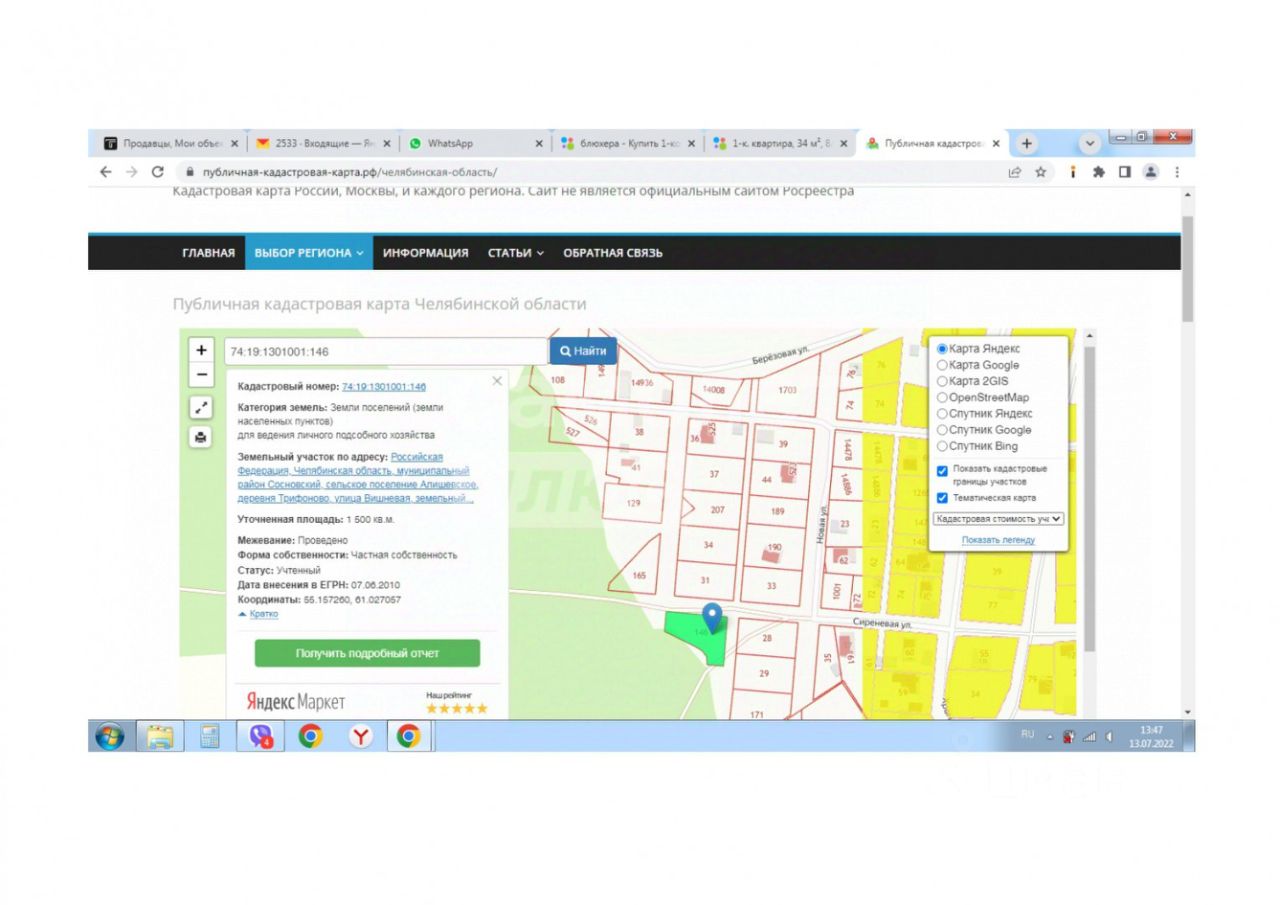 Категория земель: земли населенных пунктов. Вид разрешенного использования: Для объектов жилой застройки. Площадь 1500 (одна тысяча пятьсот) кв. м, точный адрес: Россия, Челябинская область, Сосновский муниципальный район, Алишевское сельское поселение, деревня Трифоново, улица Вишневая, д. 1.