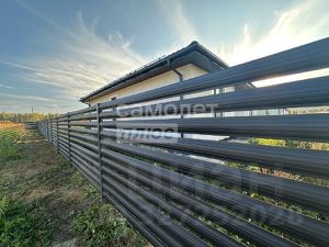 забор по периметру "Горизонтальный штакетник" + забор "Горизонтальные ламели"со стороны парадного входа в современном стиле (горизонтальные ламели)