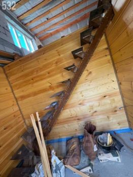 На 1-м этаже сделана отделка фальшбрусом, так же установлен металлический каркас лестницы.