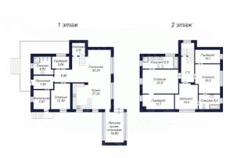 На первом этаже: кухня-гостиная с выходом на закрытую террасу, гостевая спальня, гостевой сан.узел, гардеробная, котельная;
