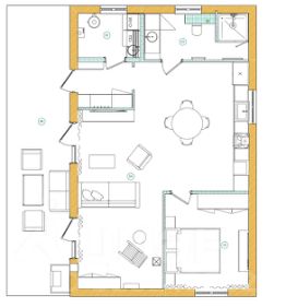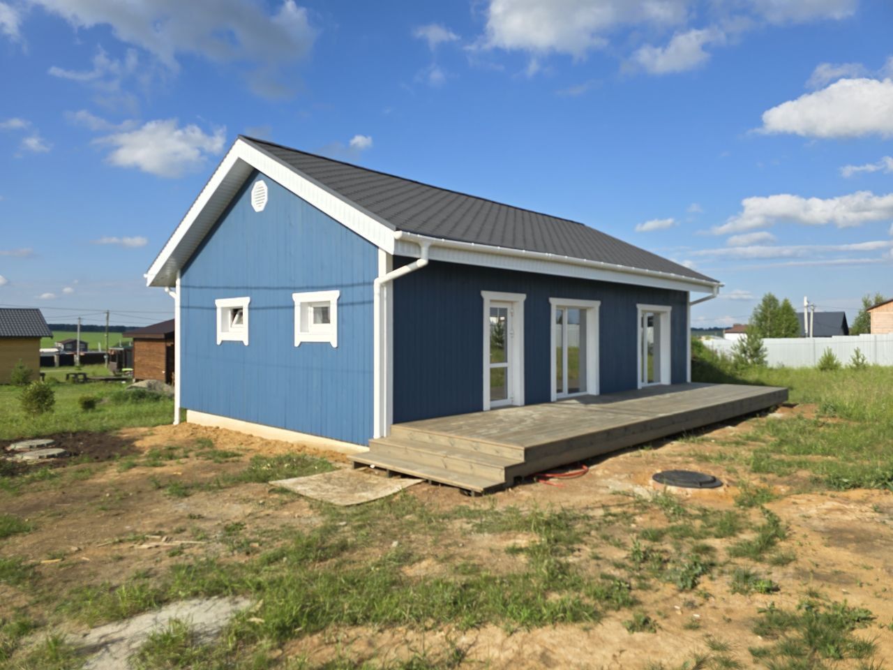 Прилагается фото примерного дизайн-проекта дома. Комната, холл, техническая комната, санузел, кухня-гостиная. Также имеется возможность организовать вторую комнату. Панорамное остекление. Терраса. Участок ровный, сухой, правильной формы.