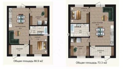 Первый этаж: Просторная кухня-гостиная, где будет приятно собираться всей семьей и принимать гостей, а также две уютные спальни для комфортного отдыха.