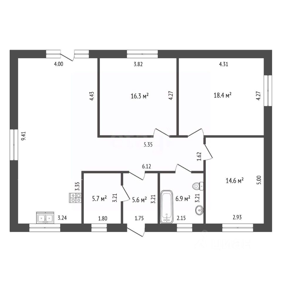 •Проект включает: входную группу, коридор, котельную, два санузла, три спальни, просторную кухню-гостиную с выходом на участок.