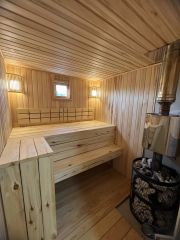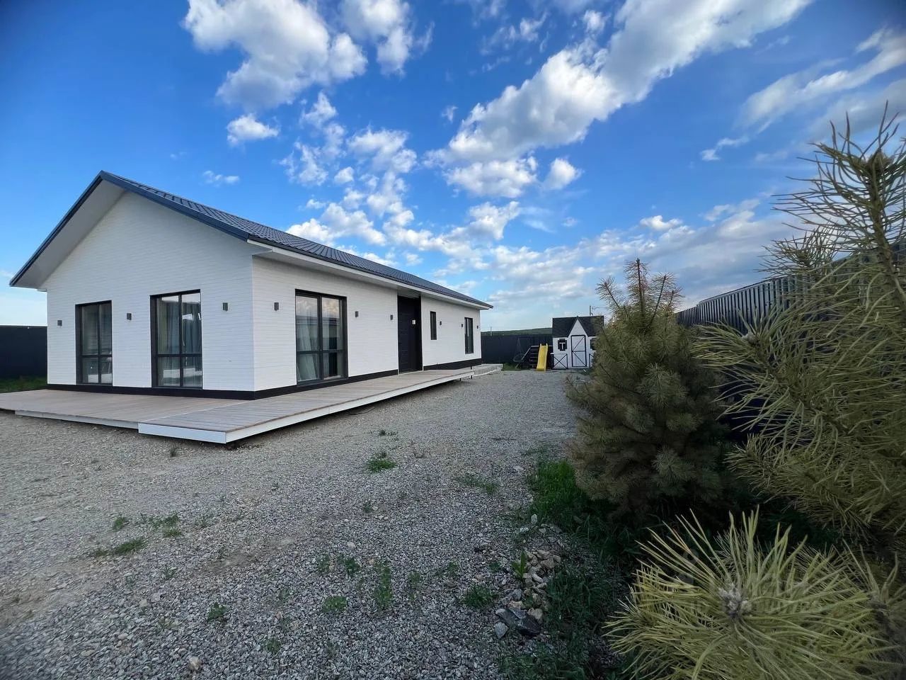 В этом доме продумана каждая зона: есть большая парковка на 4-5 машин (плюс можно ставить машины в тупиковом переулке), отдельная баня, беседка 3 на 6, детская площадка со своим домиком, горкой, скалодром и качелями, мангальная зона с подвесными качелями, отдельно стоящий хозблок, а также место для пары грядок.