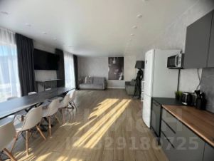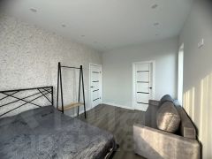 Гостиная- кухня 40кв.м с панорамными окнами и выходом на террасу. На полу керамогранит.