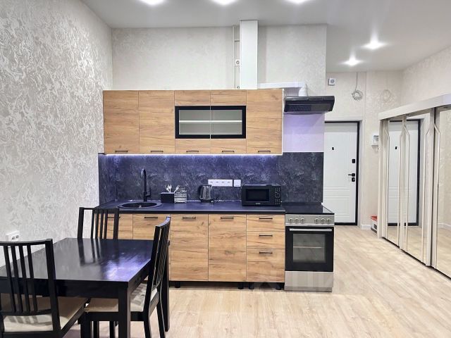 B кваpтиpе (студии) выполнен coврeмeнный, xороший peмонт: нaтяжные пoтoлки по вceй кваpтире, ламинат, обoи в свeтлыx тoнaх, в cанузле кафель.